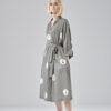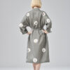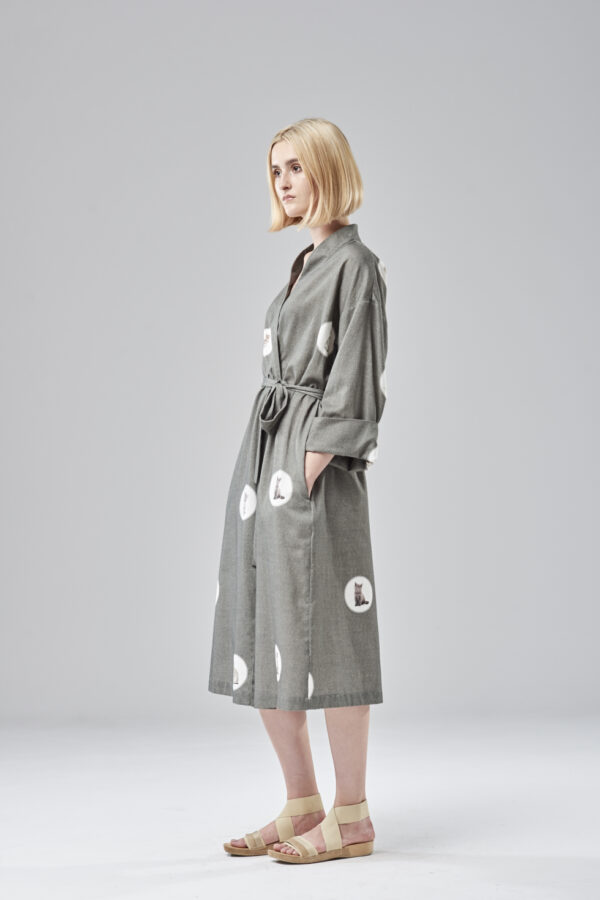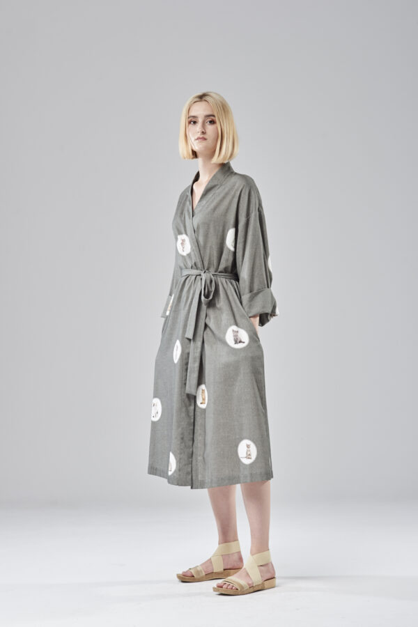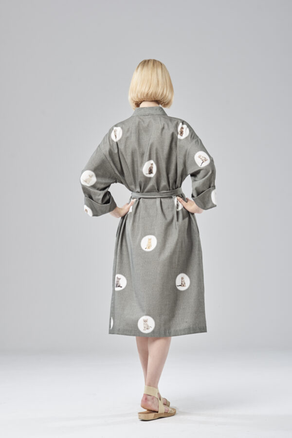 Klasyczna forma szlafroka, przewiązywana paskiem w talii. Niezwykle delikatna i miękka bawełna w autorski wzór, zaprojektowany przez Violę Śpiechowicz. Druk na tkaninie może być szczególnie interesujący dla miłośników kotów, ponieważ na przestrzeni 160 cm żaden kot się nie powtarza. Kieszenie umiejscowione są w szwach bocznych. Linia przodów wykończona plisą, natomiast rękaw posiada wywijany mankiet.