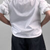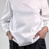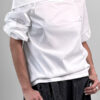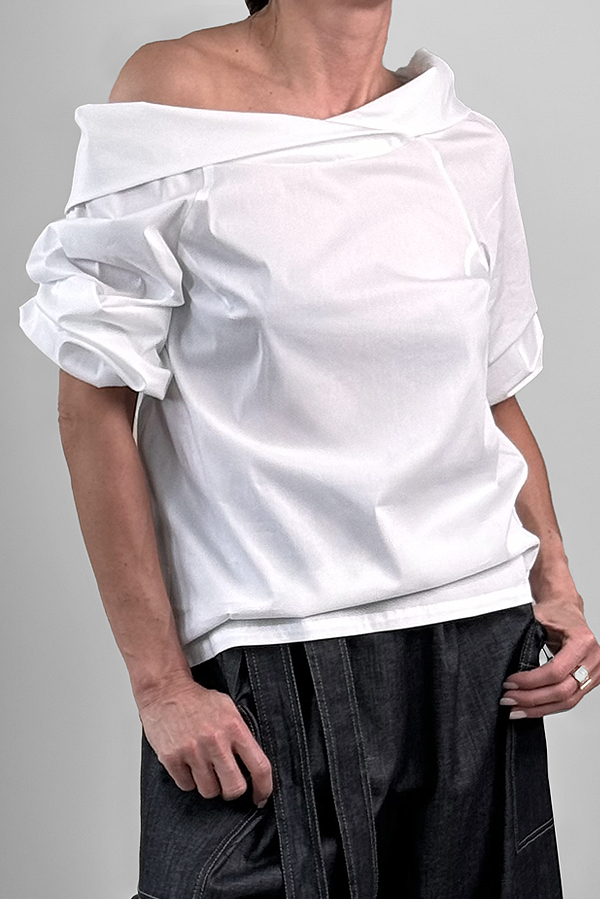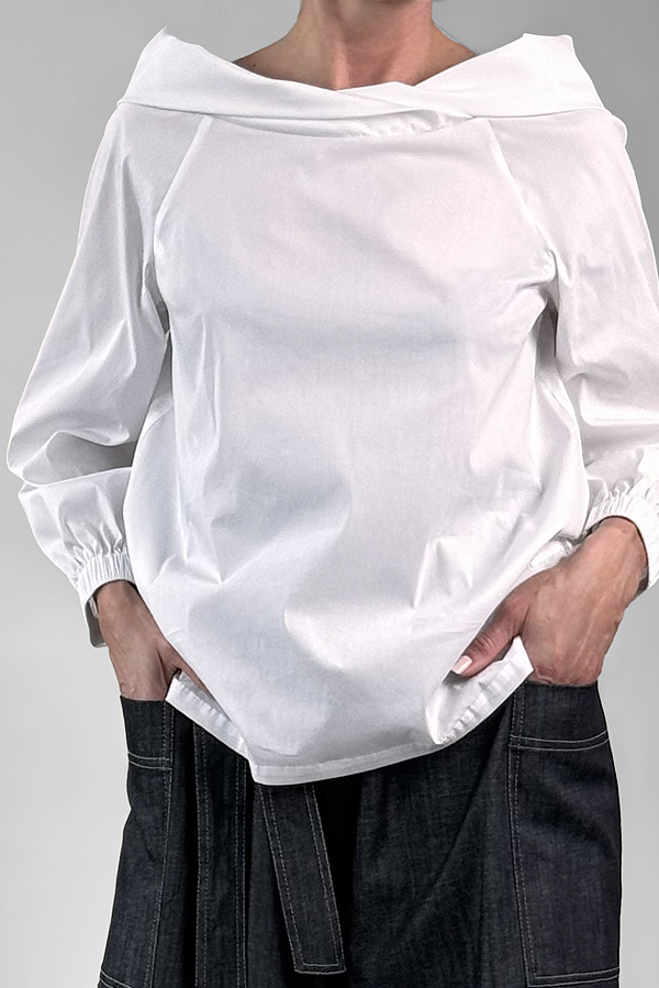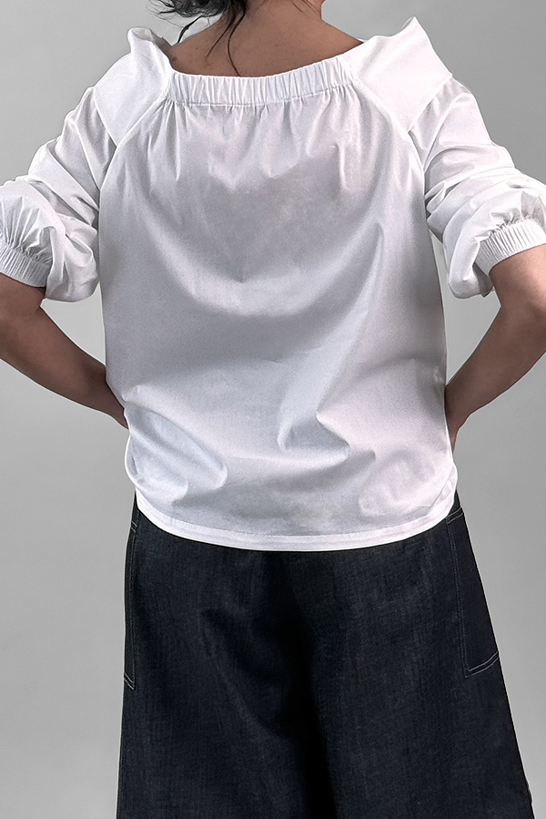 Bluzka odsłaniająca ramiona. Dół rękawów jest ujęty w szeroką gumkę, więc można go podciągać na różne wysokości. Dekolt jest wykończony kołnierzem, którego tył zamienia się w tunel z szeroką gumą.