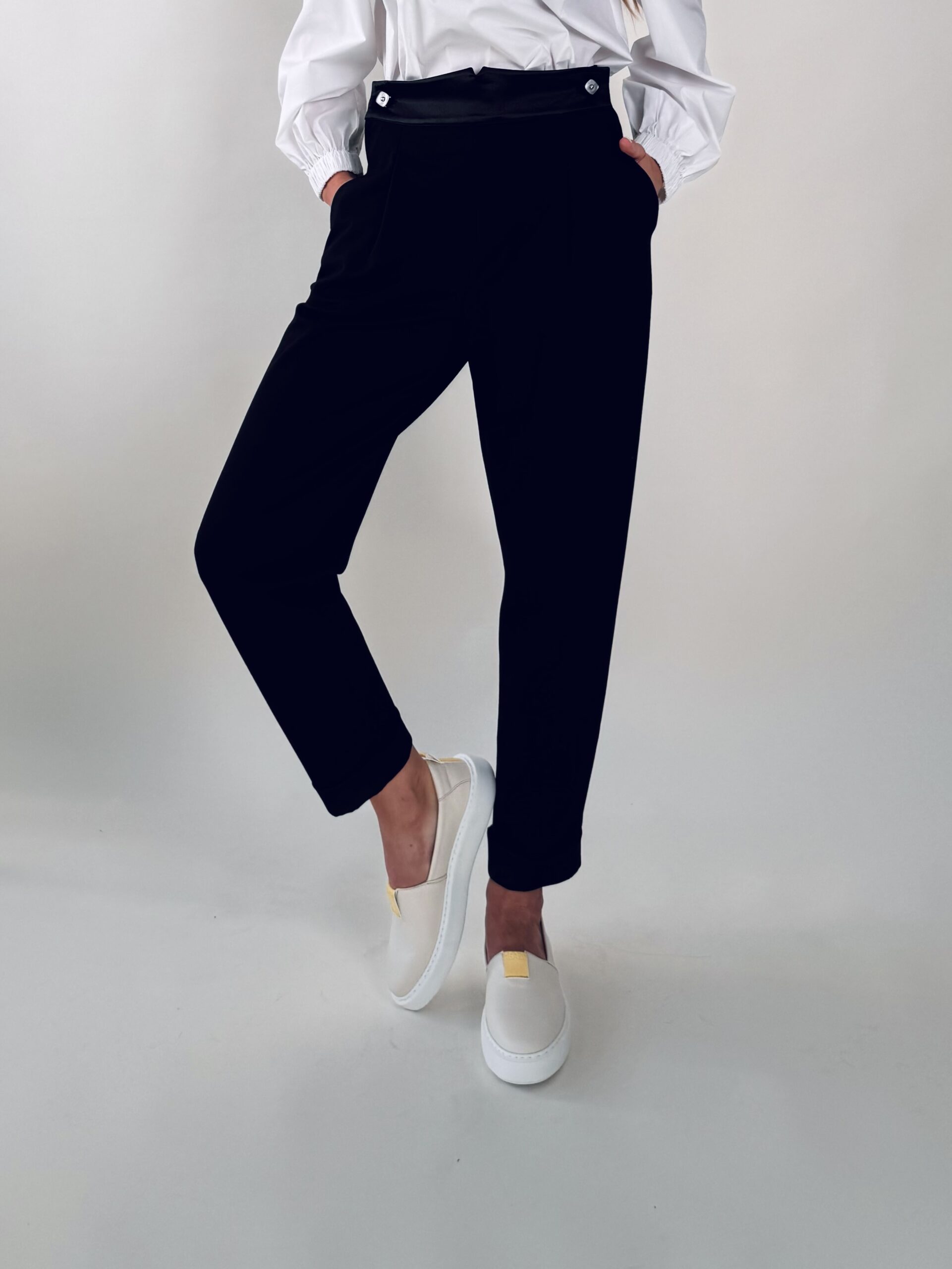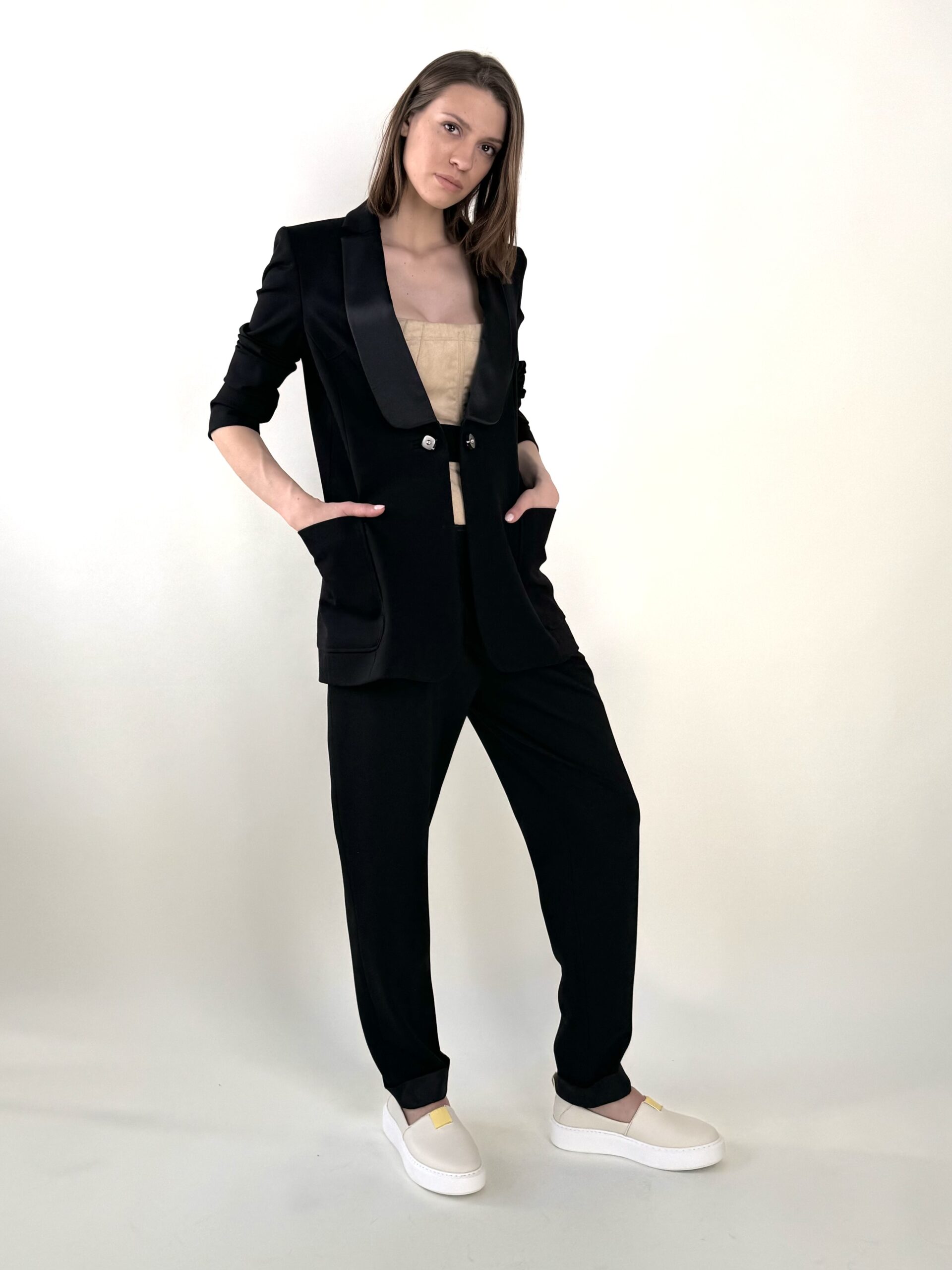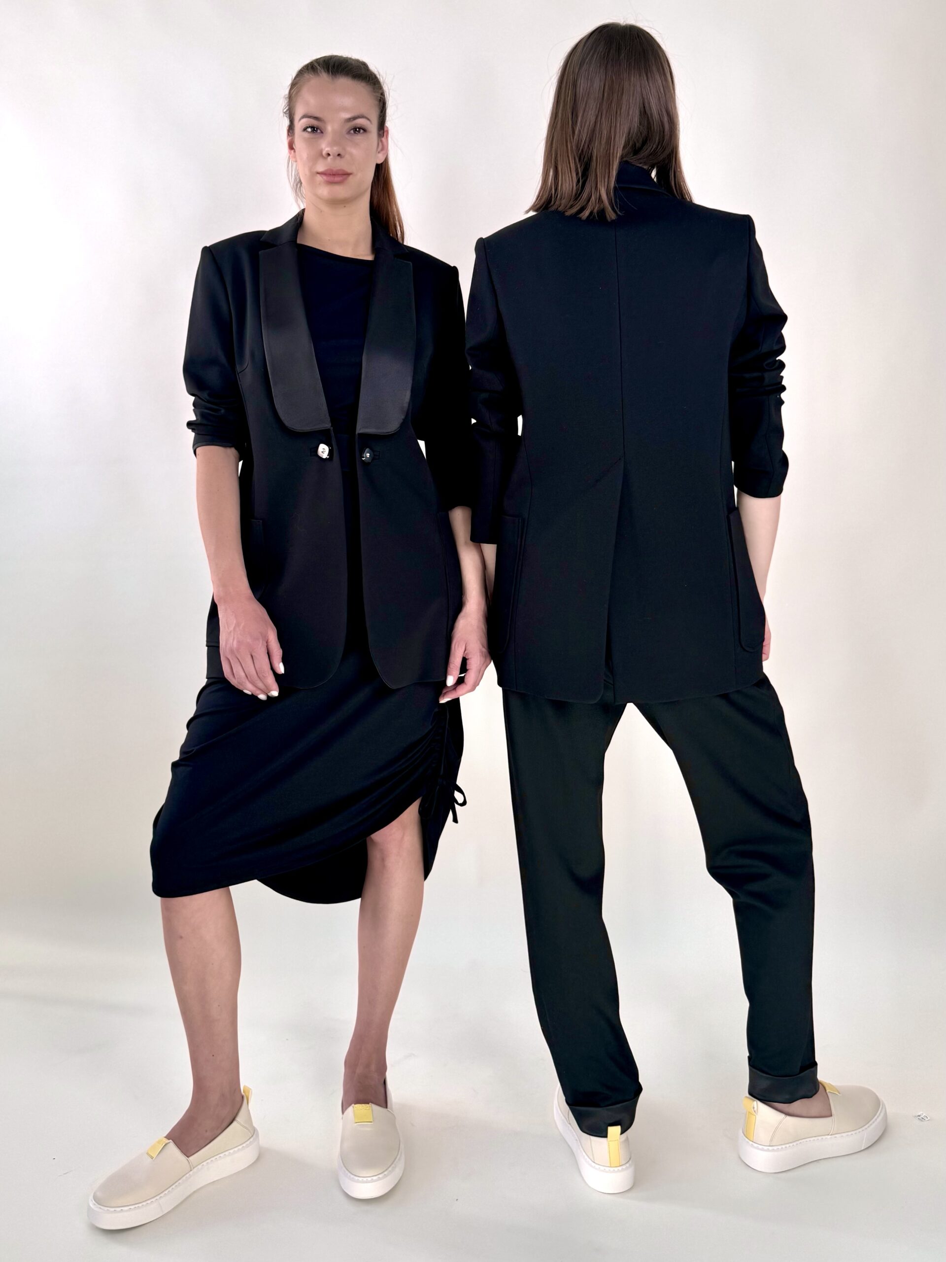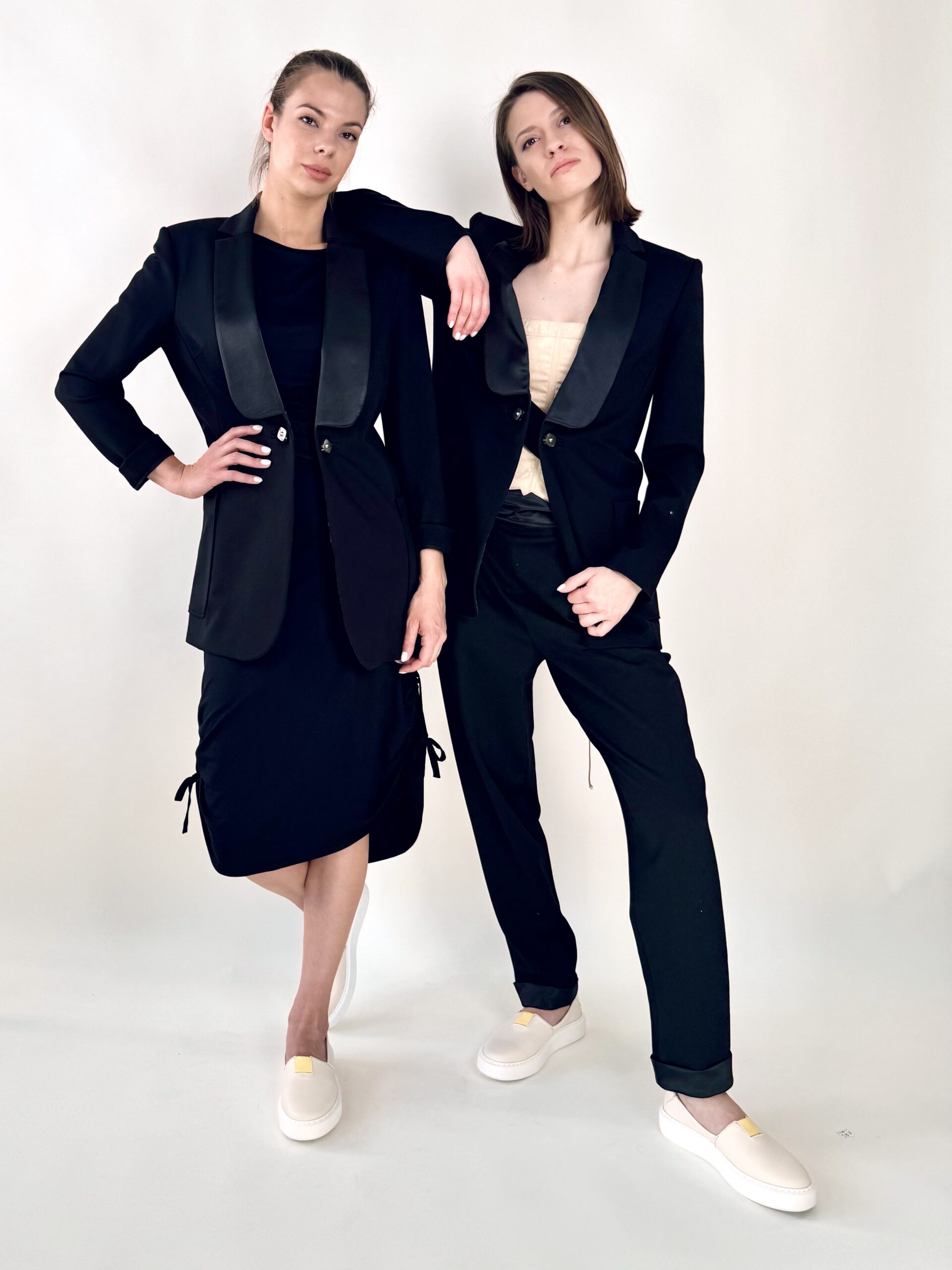 Garnitur w swobodnej stylistyce, ze sportowymi i wieczorowymi akcentami, zawartymi w jednej formie. Smokingowe klapy marynarki są zaakcentowane zapięciem na patkę, na której są umieszczone guziki. Marynarka na odcinku tułowia jest podklejona szermezą, dla utrzymania właściwej sztywności formy. Rozporek tyłu sięga do talii. Klapy, góra spodni i mankiety są uszyte z jedwabnej satyny. Tkanina zasadnicza, to wiskozowe, nie ulegające zagnieceniom punto. Marynarka ma lekko elastyczne rękawy, co pozwala je swetrowo podciągać. Spodnie zachowując elegancką formę, dzięki elastyczności są niezwykle wygodne. Istnieje możliwość precyzyjnego dobrania rozmiaru spodni, przy podaniu wymaganej długości, obwodu talii i bioder.