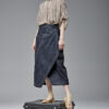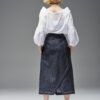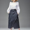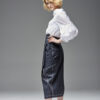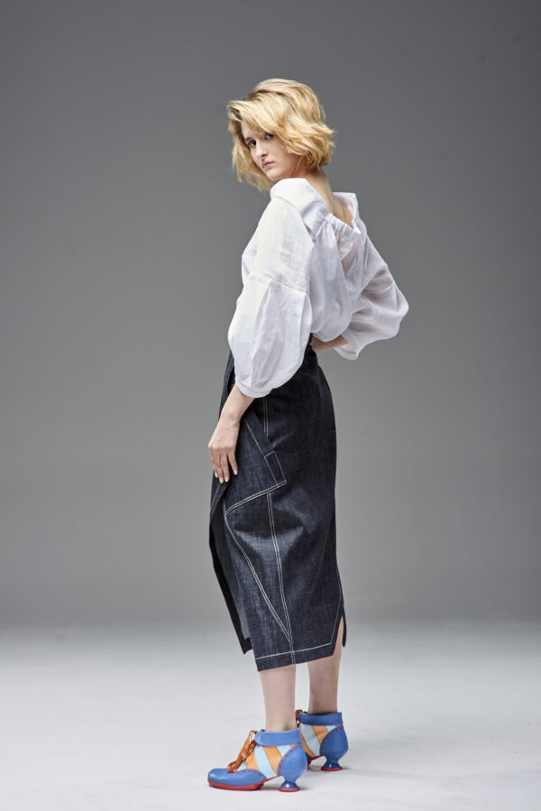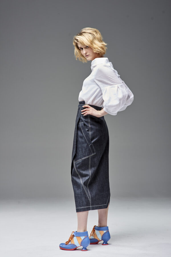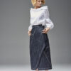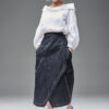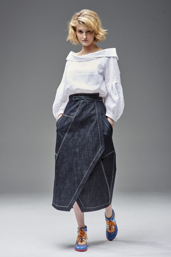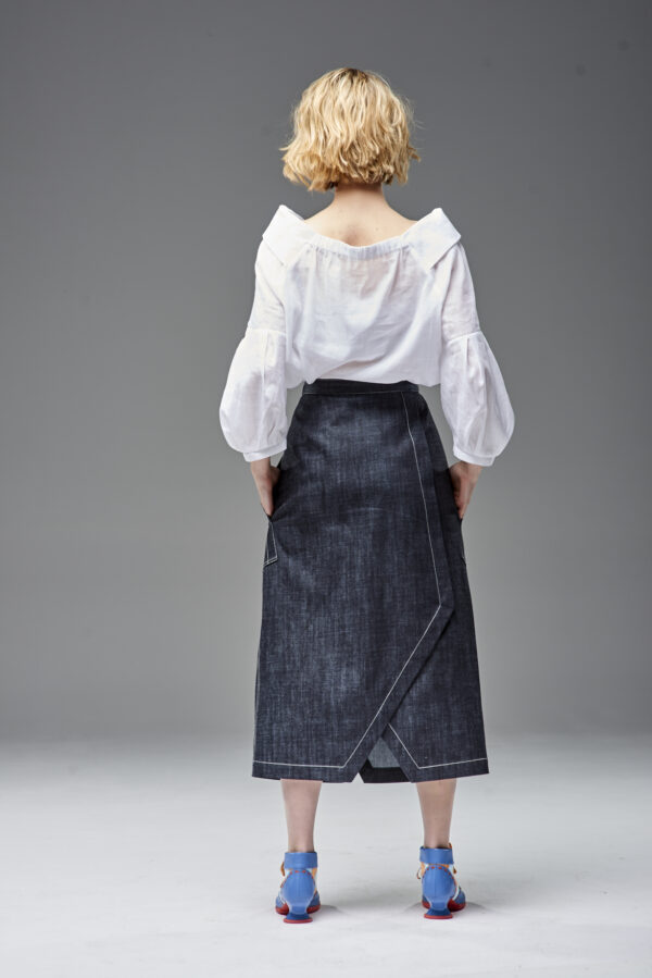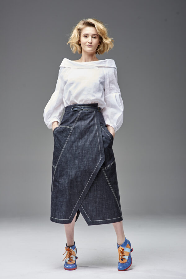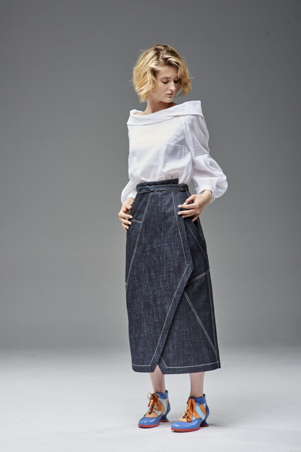 Jeansowa spódnica kopertowa z naszywanymi kieszeniami. Oryginalna konstrukcja wydobyta podwójnymi kontrastowymi stebnowaniami. Mimo dość wąskiej linii daje swobodę ruchów dzięki nakładanej konstrukcji przodu i tyłu. Oryginalna regulacja zapięcia pozwala na idealne dopasowanie talii. Guziki obciągane są jeansem. Z boku spódnicy jest klamerka, przez którą przeciąga się pasek w kierunku guzika.