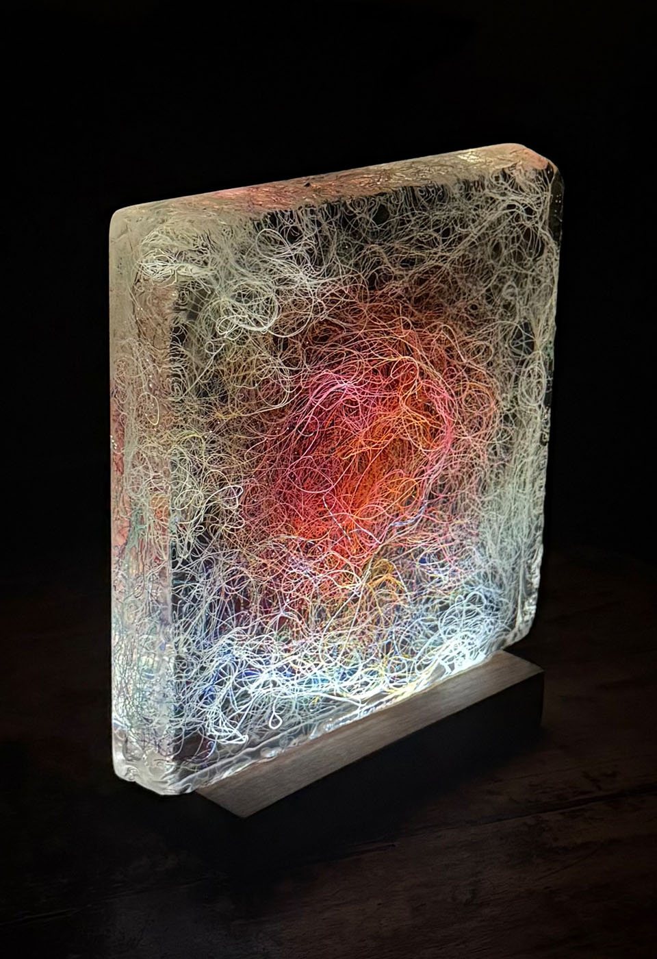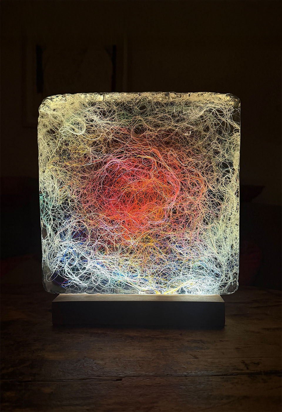 Lumisfera to artystyczny obiekt świetlny Violi Śpiechowicz, efekt eksperymentów z przestrzenią, światłem i materiałem. Transparentny blok z żywicy epoksydowej zawiera zatopiony tekstylny obraz, który po włączeniu podświetlenia LED zamienia się w trójwymiarową, hipnotyzującą kompozycję. Delikatne światło działa kojąco, tworząc w przestrzeni atmosferę wyciszenia i harmonii.