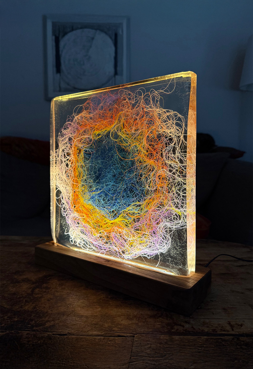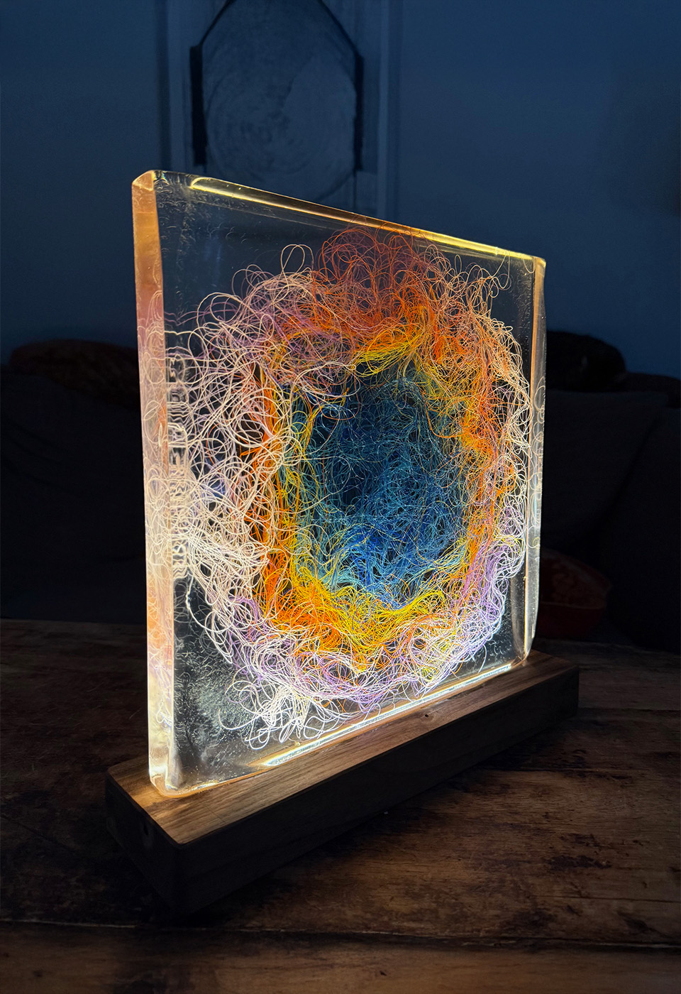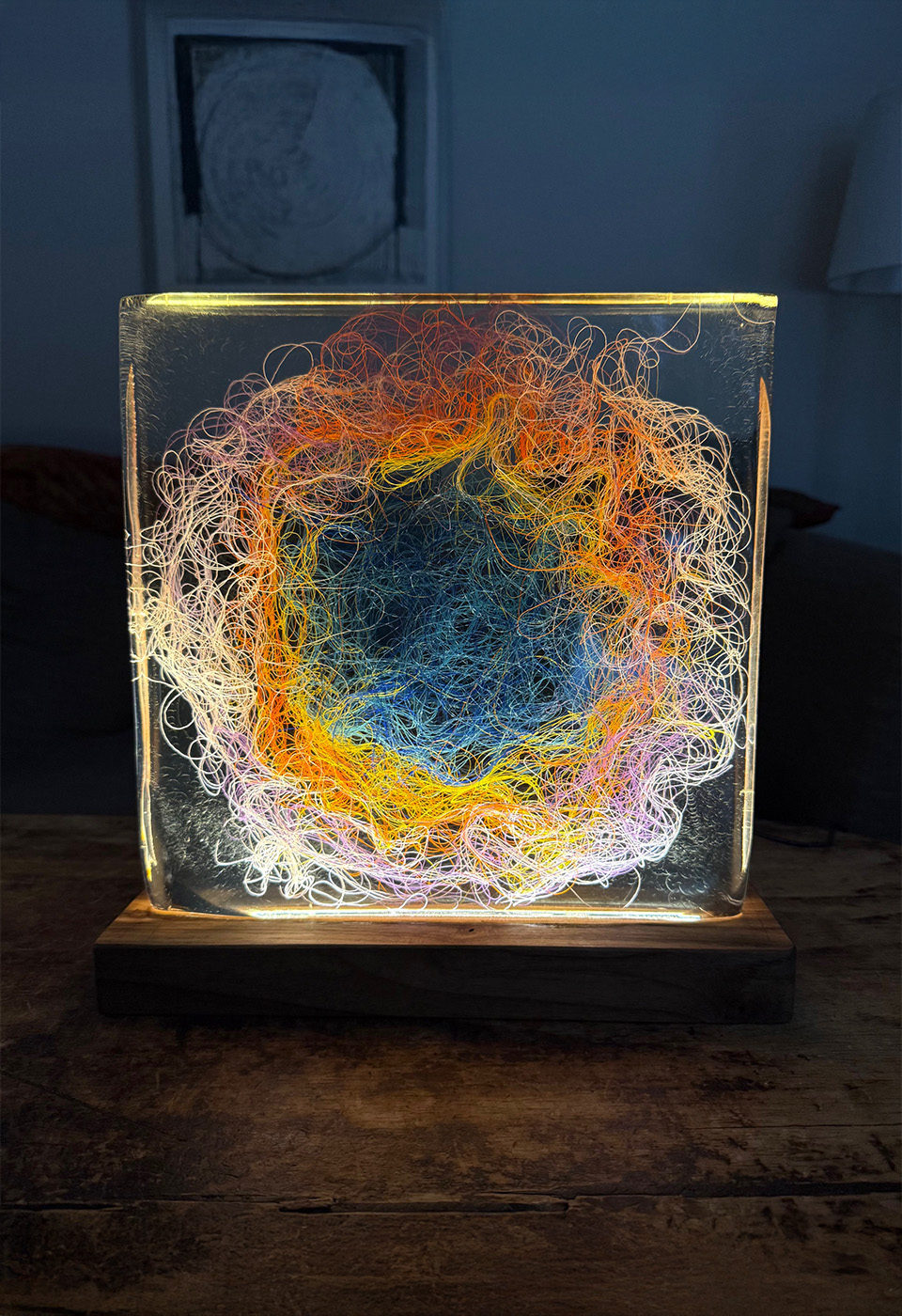 Lumisfera to artystyczny obiekt świetlny Violi Śpiechowicz, efekt eksperymentów z przestrzenią, światłem i materiałem. Transparentny blok z żywicy epoksydowej zawiera zatopiony tekstylny obraz, który po włączeniu podświetlenia LED zamienia się w trójwymiarową, hipnotyzującą kompozycję. Delikatne światło działa kojąco, tworząc w przestrzeni atmosferę wyciszenia i harmonii.