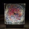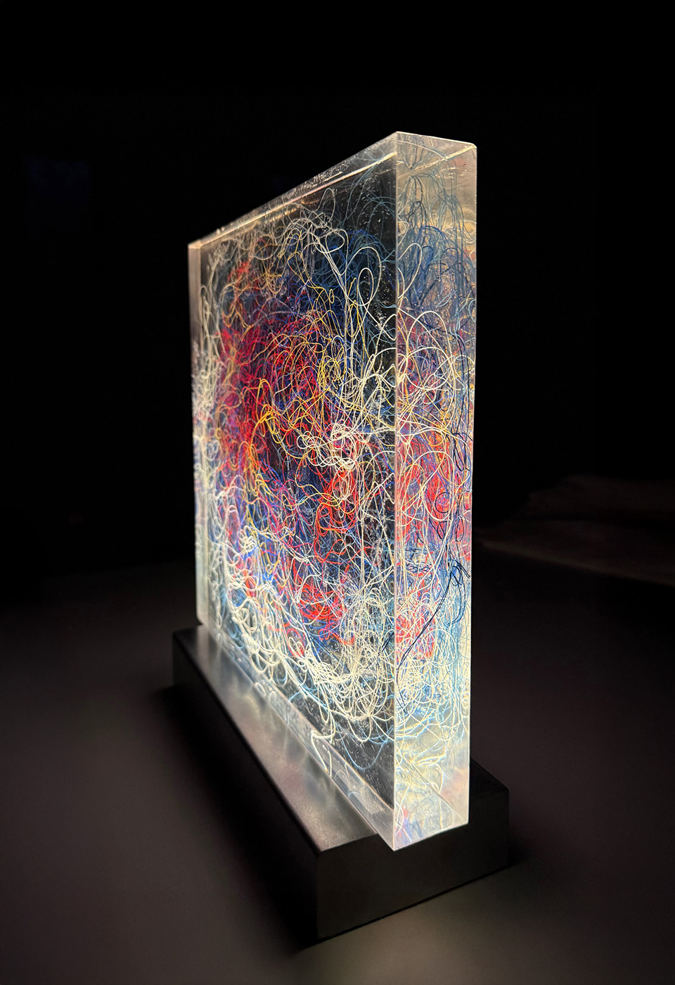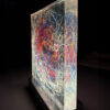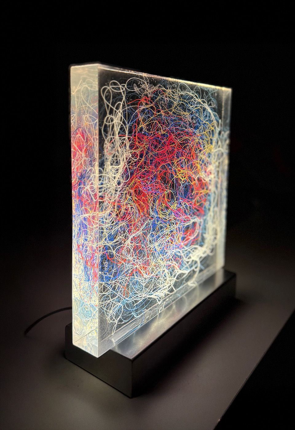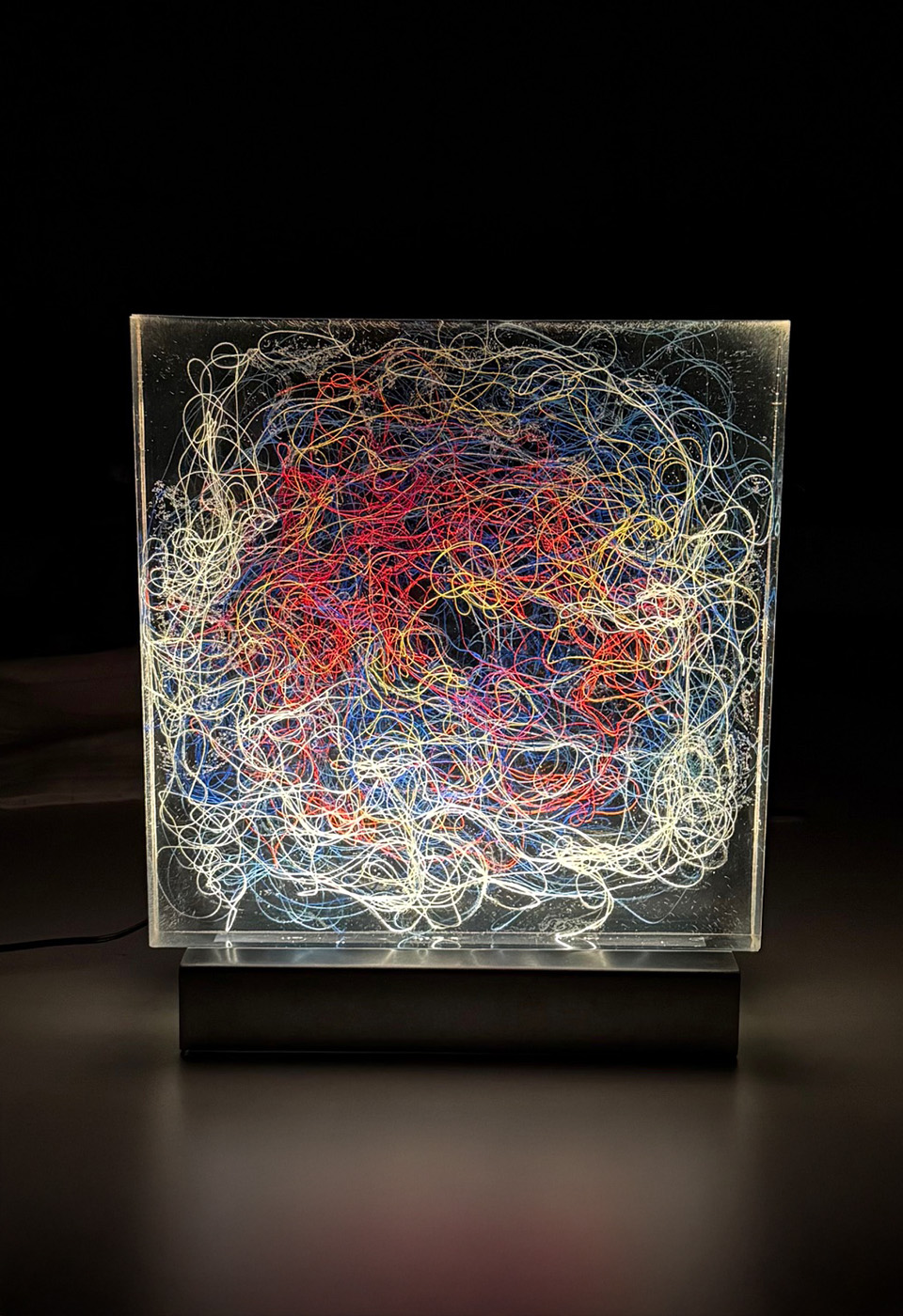 Lumisfera to artystyczny obiekt świetlny Violi Śpiechowicz, efekt eksperymentów z przestrzenią, światłem i materiałem. Transparentny blok z żywicy epoksydowej zawiera zatopiony tekstylny obraz, który po włączeniu podświetlenia LED zamienia się w trójwymiarową, hipnotyzującą kompozycję. Delikatne światło działa kojąco, tworząc w przestrzeni atmosferę wyciszenia i harmonii.