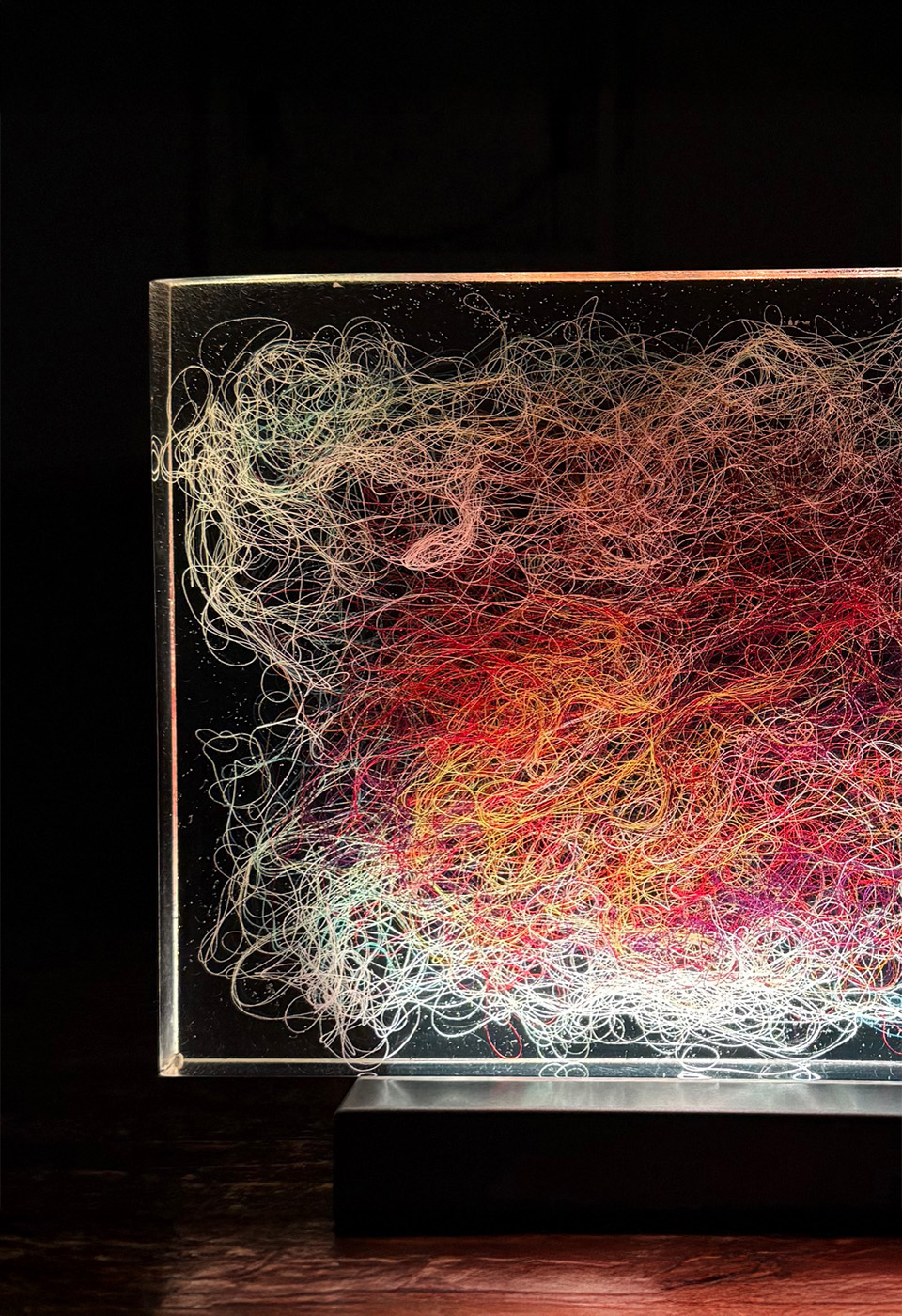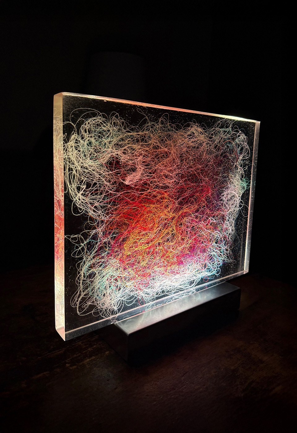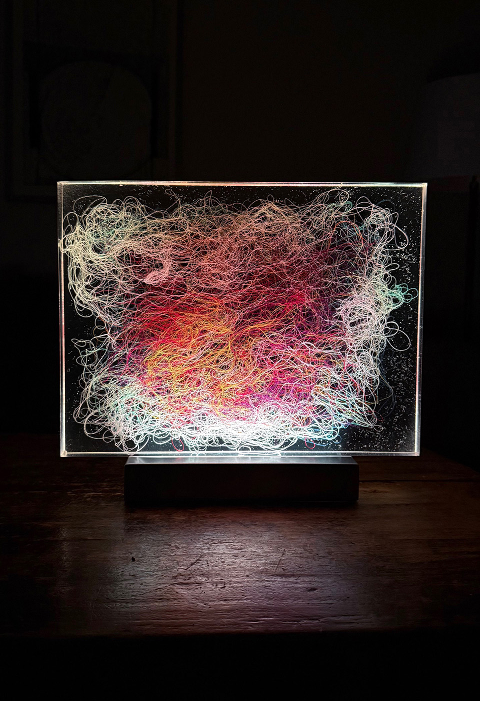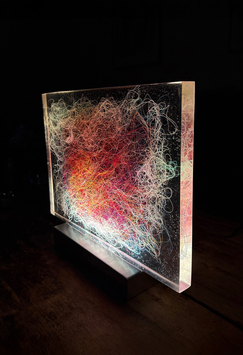 Lumisfera to artystyczny obiekt świetlny Violi Śpiechowicz, efekt eksperymentów z przestrzenią, światłem i materiałem. Transparentny blok z żywicy epoksydowej zawiera zatopiony tekstylny obraz, który po włączeniu podświetlenia LED zamienia się w trójwymiarową, hipnotyzującą kompozycję. Delikatne światło działa kojąco, tworząc w przestrzeni atmosferę wyciszenia i harmonii.