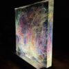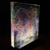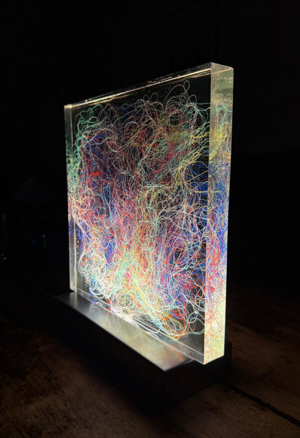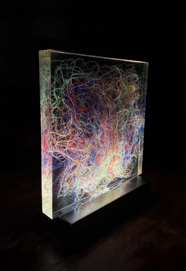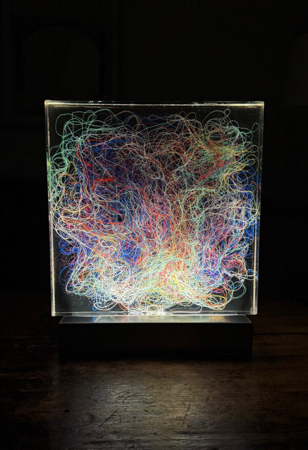Lumisfera to artystyczny obiekt świetlny Violi Śpiechowicz, efekt eksperymentów z przestrzenią, światłem i materiałem. Transparentny blok z żywicy epoksydowej zawiera zatopiony tekstylny obraz, który po włączeniu podświetlenia LED zamienia się w trójwymiarową, hipnotyzującą kompozycję. Delikatne światło działa kojąco, tworząc w przestrzeni atmosferę wyciszenia i harmonii.