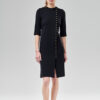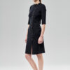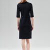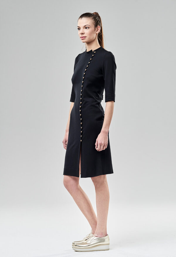 Ascetyczna a zarazem sexowna sukienka ze stójką, zapinana asymetrycznie na rząd guzików. Jej atutem jest dopasowanie do sylwetki i wygoda, dzięki elastyczności dzianiny o nazwie Punto. Zapięta ręcznie układanymi pętelkami na ostatni guzik, wygląda ascetycznie. Ale można ją również zakładać do spodni i topu zapiętą tylko w talii, wtedy staje się sukienkową narzutką. Oryginalna konstrukcja kuli rękawa sięgającego za łokieć, z cięciem biegnącym wzdłuż jego zewnętrznej części. Zapięcie na pętelki i grzybkowe guziki. Usztywniona, płaszczowa patka z tyłu, zamocowana na guziki.