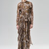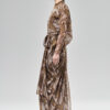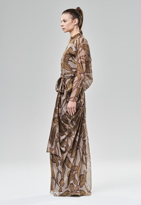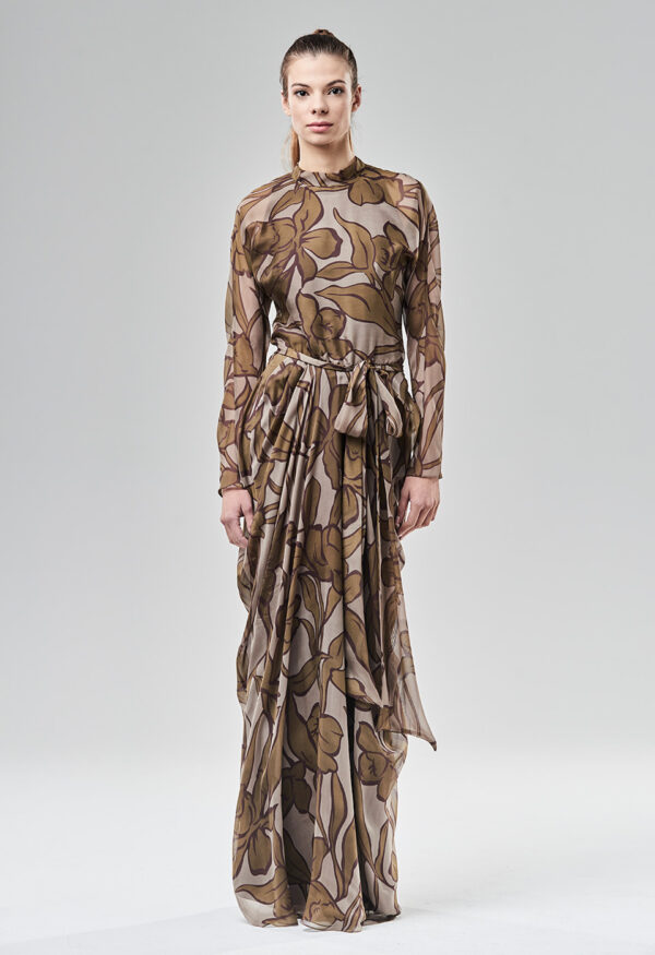 Zmysłowa i poetycka suknia wieczorowa o linii syreny. Góra jest wykończona stójką wiązaną z tyłu, natomiast linia dekoltu wykończona wiązaniem. Kimonowa konstrukcja rękawa, mimo dostojności formy, daje dużą swobodę. Podobnie dół, który zapada się ku dołowi i sprawia wrażenie syreny, tak naprawdę jest obszerny i wygodny – sprawdza się również podczas tańca. Plecy spływają luźno i są oddzielone od pasa w tylnej części sukni. Kryty suwak z tyłu sukni, a pasek do wiązania z przodu, wychodzący z boków. Istnieje możliwość zamówienia tego modelu w innych kolorach, z uwzględnieniem indywidualnych potrzeb klienta.