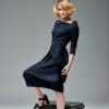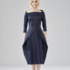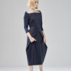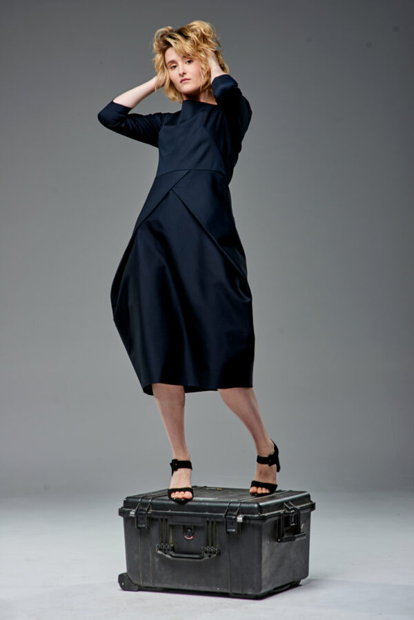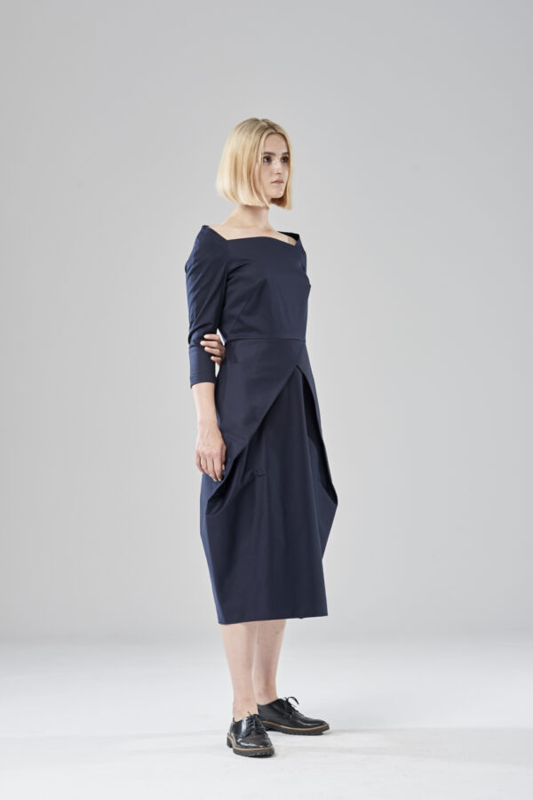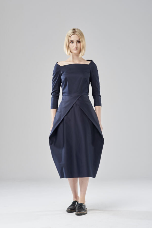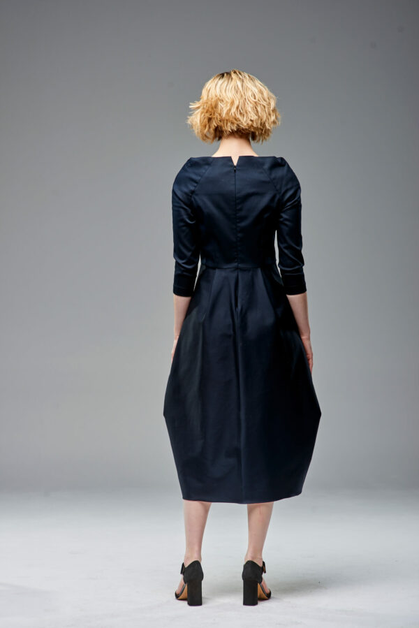 Uniwersalna sukienka z łódkowym dekoltem i suwakiem z tyłu. Dół jest ułożony z jednego kawałka tkaniny, połączonego z tyłu. Lekko streczowa satyna bawełniana zapewnia swobodę ruchów mimo mocno dopasowanej formy. Model na podszewce.