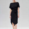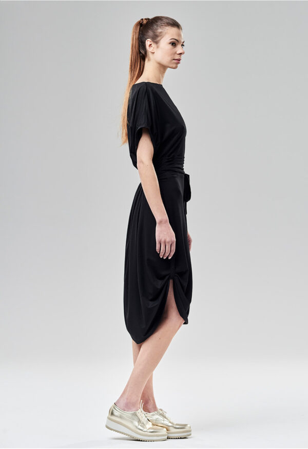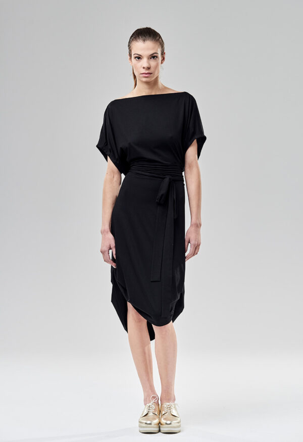 Uniwersalna sukienka z łódkowym dekoltem. Luźna konstrukcja, gdzie w bocznych szwach są umieszczone dwie części paska, którego dociągnięcie powoduje wyeksponowanie sylwetki z drapowanym przodem. Oryginalne drapowanie przodu uzyskane precyzyjnymi rygielkami rozstawionymi co parę centymetrów. Pasek może być wiązany z tyłu na dużą kokardę, albo tylko skrzyżowany z tyłu i przechodzący do przodu. Ten sposób dopasowania do sylwetki powoduje, że przód przylega do figury, natomiast tył jest luźny i lekko zbluzowany, również dzięki odchodzącej od dekoltu kontrafałdzie. Boki sukienki mogą być podciągnięte patką zapinaną na guzik, albo puszczone luźno. Jest również możliwość podpięta boków. Kimonowy rękaw zamknięty zakładkami. Wykończenia dwu centymetrowymi pasmami obszyć.
