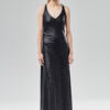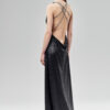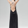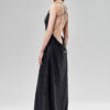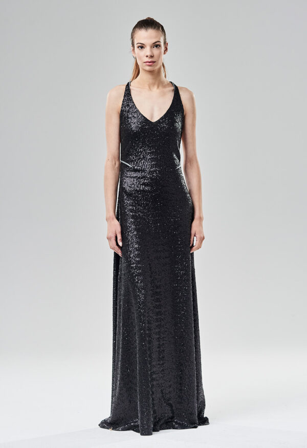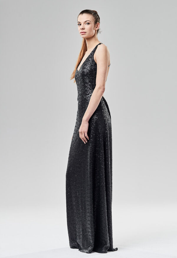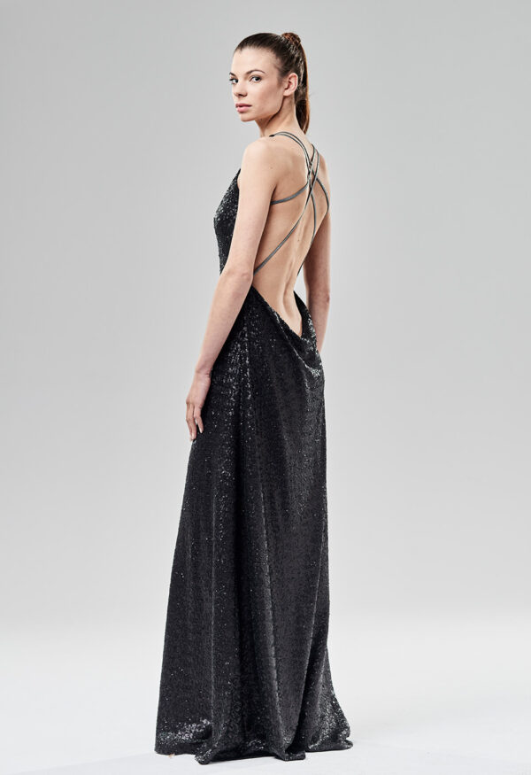 Wieczorowa suknia z tkaniny w drobne cekiny. Struktura tkaniny i konstrukcja modelu wspaniale podkreślają figurę, a głęboki dekolt z tyłu eksponuje plecy. Wykończenia i cienkie szelki wykonano z nabłyszczanego srebrnego lnu, podobnie jak podkreślające seksowne kobiece kształty wstawki biegnące od talii wzdłuż bioder. Szelka jest naturalnym przedłużeniem konstrukcyjnym srebrnej linii przechodzącej po biodrze, co wprowadza dynamizm konstrukcyjny. Szelki skrzyżowane na plecach. Wewnątrz suknia jest podszyta cienką dzianinową podszewką wiskozową. Dzięki elastyczności i głębokiemu dekoltowi nie zachodzi potrzeba dodatkowego rozpinania. Długość sukni można ustalić podczas składania zamówienia.