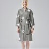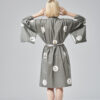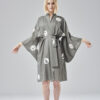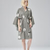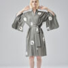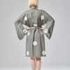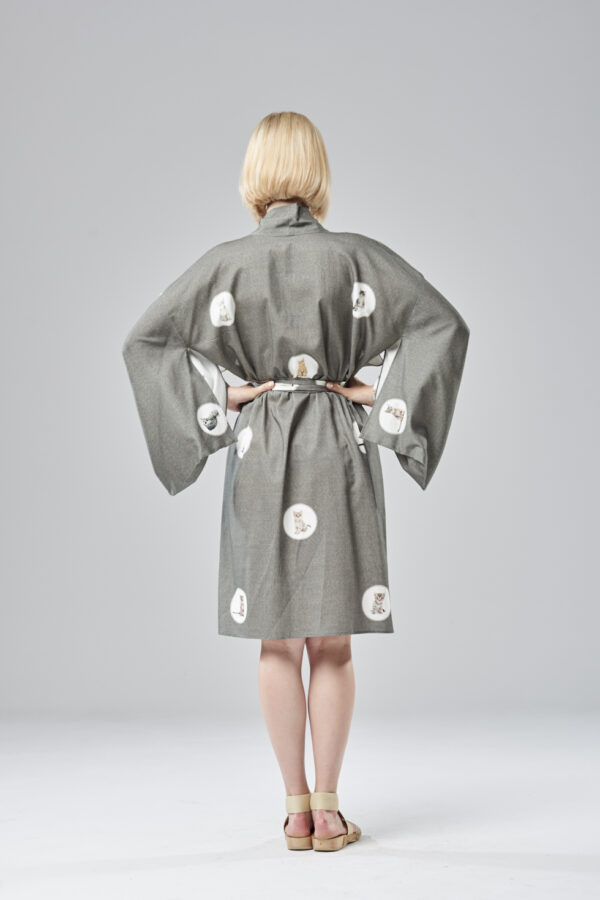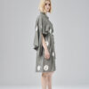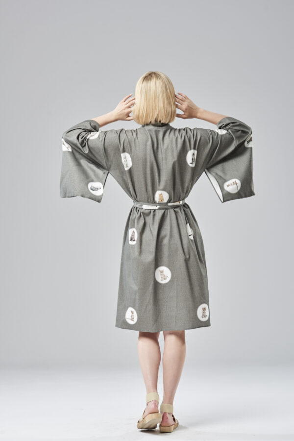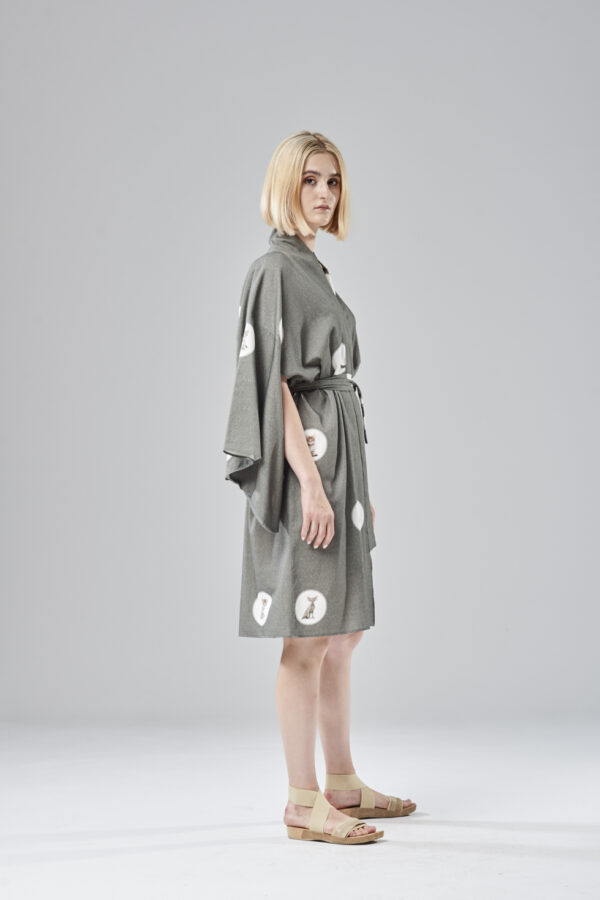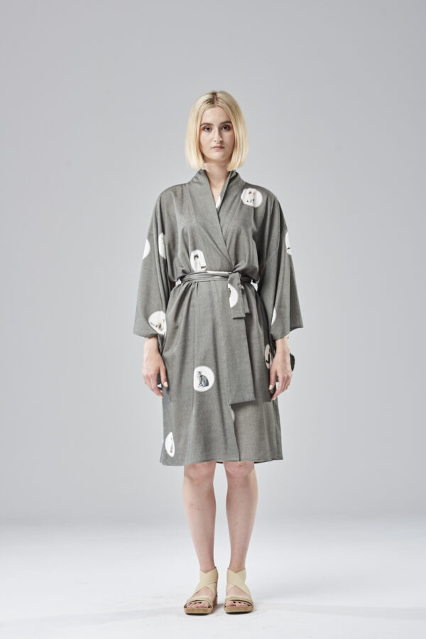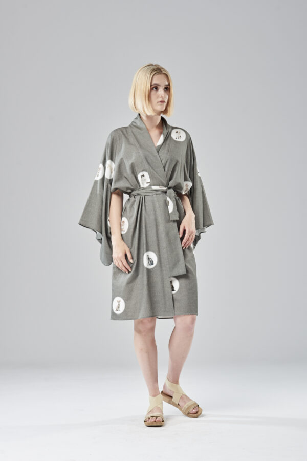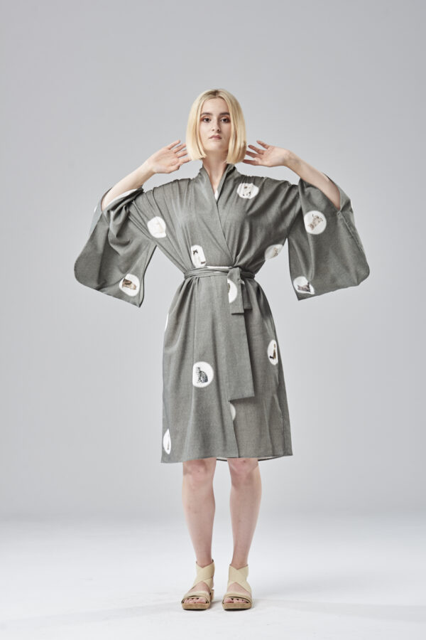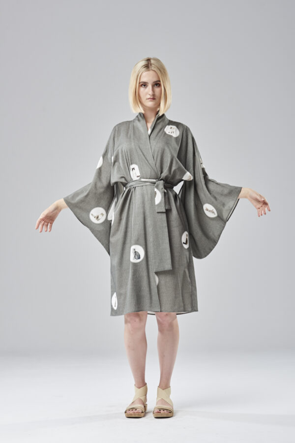 Forma inspirowana klasycznym kimonem japońskim. Ten rodzaj rękawa można nosić na dwa sposoby, z wykorzystaniem rękawa, albo traktując go pelerynowo, przez wypuszczenie ręki w miejscu podkroju pachy. W panelach wypuszczowych ze szwów bocznych są umieszczone kieszenie. Dół jest wykończony głęboką zakładką. Kimono jest wielofunkcyjne, może być sukienką, szlafrokiem lub letnim płaszczem. Druk na tkaninie to limitowany projekt Violi Śpiechowicz.